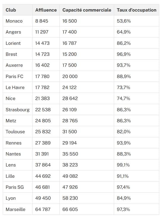 Affluences et taux d’occupation de la Ligue 1 après 7 journées de championnat selon Sportune :
