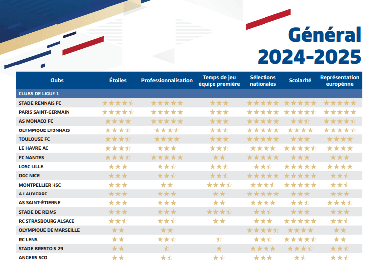 La publication récente du classement des centres de formation de Ligue 1 par la FFF n’arrange rien : le RC Lens y figure à une inquiétante 16e place sur 18. Un signal alarmant qui montre que le club est loin de rivaliser avec les meilleures structures hexagonales.