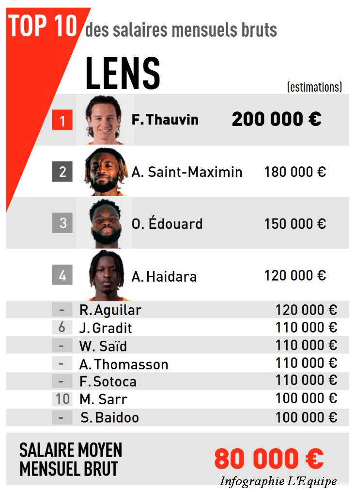 La masse salariale dépassait encore les 40 M€ bruts, en mai 2025, et a été réduite à hauteur de 28 M€ pour cette saison. Pour autant, onze joueurs dépassent encore la barre des 100 000 euros mensuels, preuve que Lens reste aligné avec les standards des clubs ambitieux de Ligue 1. Le salaire moyen, lui, tourne autour de 80 000 euros bruts.